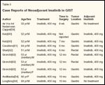 GISTs may present as unresectable disease or as resectable tumors requiring extensive organ disruption. Additionally, recurrence of locally advanced disease remains the norm. Thus, trying to achieve tumor downsizing with imatinib, followed by resection, followed (perhaps) by more imatinib could be an attractive approach. Since 2003, several case reports related to the use of neoadjuvant treatment in GIST have been published (Table 3), and one phase II Intergroup trial has been completed. The usual therapeutic schema involves a short course of imatinib, commonly 3 to 12 months, with frequent imaging studies and reevaluation of the best time for surgery. The decision of when to operate-at first respectability vs after maximum response-remains controversial, particularly since progression can occur rapidly even after a substantial response.