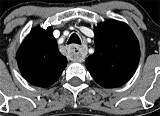 Esophageal cancer as seen on CT; source: Hellerhoff, Wikimedia Commons