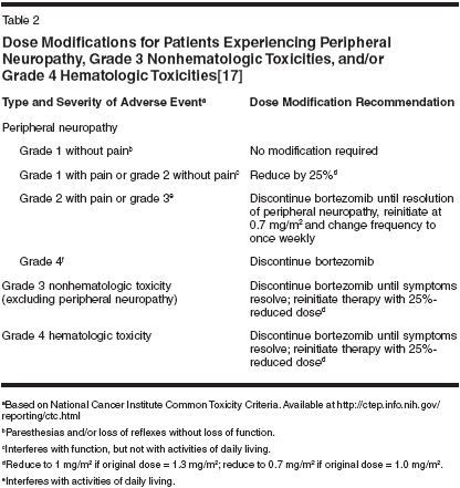 The recommended bortezomib dose for multiple myeloma is 1.3 mg/m2 administered as a 3- to 5-second IV bolus.[14,17] Administration is repeated twice weekly for 2 weeks, with a minimum of 72 hours between doses to allow for restoration of proteasome function in normal cells.[17] Each cycle of four doses is followed by a 10-day rest (ie, bortezomib is administered on days 1, 4, 8, and 11, followed by no administration on days 12 through 21). Dose modifications are recommended to manage peripheral neuropathy, grade 3 nonhematologic toxicities, and grade 4 hematologic toxicities (see Table 2).[17] Drug Interactions