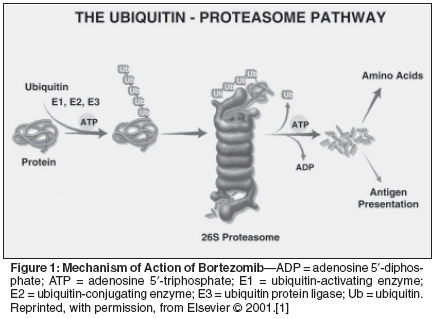 Normal cellular function and homeostasis depend on precisely controlled intracellular processes, including the systematic and highly regulated degradation of proteins that control cellular division, growth, function, and death.[1-3] For example, regulation of the cell cycle depends on the orderly degradation of cyclins and inhibitors of the cyclin-dependent kinases.[1] If the systematic degradation of proteins is interrupted, regulatory proteins accumulate within the cell, creating an imbalance in the number of proteins required to elicit certain cellular functions, such as progression from the G1 to the S phase of the cell cycle or activation of signal transduction pathways.[ 4,5] In eukaryotic cells, the ubiquitinproteasome pathway (UPP), comprising a ubiquitin-conjugating system and the proteasome, is primarily responsible for the degradation of cellular proteins and plays an important role in many basic cellular processes.[ 5-7] The list of cellular proteins controlled by the UPP is growing rapidly and includes, in addition to the cell-cycle regulatory proteins (eg, cyclins, cyclin-dependent kinase inhibitors), proteins involved in chromatid separation, oncogenes and tumor suppressor genes, and transcriptional activators and inhibitors.[5,7-10] Another important function of the UPP is the selective removal of mutated and denatured or misfolded proteins, as well as proteins damaged by stress, oxidation, chemicals, or viral infection.[ 1,8,10] Aberrations in the UPP have been implicated in the pathogenesis of many diseases, including certain malignancies. For example, degradation of the p53 tumor suppressor gene or p27 inhibitor of cyclin-dependent kinases can promote tumorigenesis of various malignancies, including uterine, colon, breast, and prostate cancers.[ 1,7,8] Inhibiting the activity of the proteasome, one of the key constituents of the UPP, can block cellular growth and division, ultimately leading to cell death. Because the proteasome is responsible for degrading more than 80% of cellular proteins in eukaryotic cells, its inhibition would seem incompatible with life.[5] However, the results of preclinical and early-phase clinical studies show that proteasome inhibition (PI) can arrest the growth of tumor cells, induce apoptosis, inhibit angiogenesis, and increase the sensitivity of tumor cells to chemotherapy or radiation therapy, without having a major deleterious effect on nontumor cells.[3,11-13] Based on these results, a number of synthetic PIs have been developed and evaluated as antitumor agents. Bortezomib (PS-341, Velcade), the first proteasome inhibitor to be evaluated in humans, received US Food and Drug Administration (FDA) approval for the treatment of patients with multiple myeloma previously treated with two or more therapies and with disease progression on the last therapy.[5,14-17] This article summarizes the pharmacology, pharmacokinetics, and current practical applications of bortezomib.