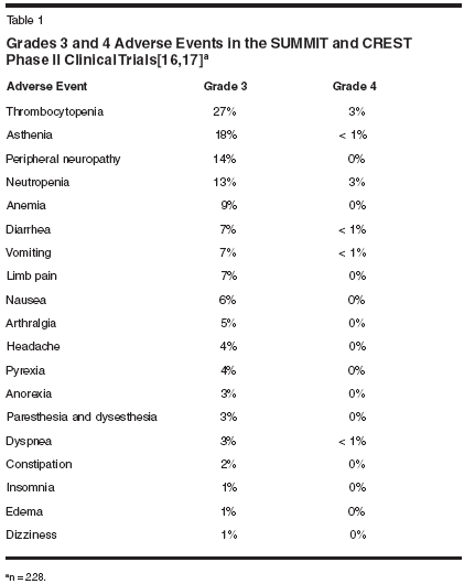 In the SUMMIT and CREST phase II trials, the most common adverse effects in multiple myeloma patients receiving bortezomib 1.3 mg/m2, included fatigue (65%), nausea (64%), diarrhea (51%), thrombocytopenia (43%), anorexia (43%), peripheral neuropathy (37%), vomiting (36%), pyrexia (36%), anemia (32%), peripheral edema (25%), and dyspnea (22%).[16,17] Table 1 lists the severe (grades 3 and 4) adverse effects observed in these trials.[16,17] Most toxicities were mild to moderate in severity (grades 1 or 2) and did not require discontinuation or delay of bortezomib therapy.
