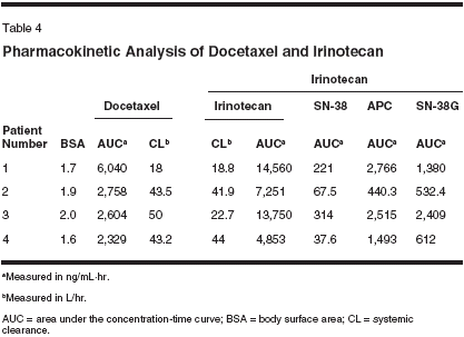 Adjei AA, Klein CE, Kastrissios H, et al:Phase I and pharmacokinetic study of irinotecanand docetaxel in patients with advancedsolid tumors: Preliminary evidence of clinicalactivity. J Clin Oncol 18(5):1116-1123, 2000.