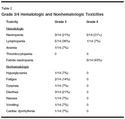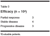 Table 1. The majority of the patientshad adenocarcinoma (11/15), and only1 out of the 15 patients enrolled wasfemale. Of the 15 patients enrolled inthe study, 14 were evaluable for toxicityand 10 for response. The toxicityprofile is described in Table 2. Unfortunately,a significant number of patientsenrolled in the study (43%) hadneutropenic fever. One patient whohad grade 4 neutropenia died of cecalperforation thought to be related tochemotherapy. Three out of the 14patients (21%) enrolled in the studyhad grade 3 diarrhea.The response data are outlined inTable 3. Three patients had a partialresponse out of 10 evaluable patients(30%), four had stable disease, and