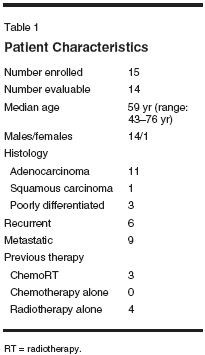 ABSTRACT: The outcomes for patients with metastatic or recurrent esophagealcancer are dismal, with 1-year survival rates of approximately 20%. Inthis phase II study, we studied the combination of docetaxel (Taxotere)and irinotecan (CPT-11, Camptosar) in patients with metastatic orrecurrent esophageal cancer. Eligible patients included those withhistologic or cytologic diagnosis of adenocarcinoma or squamouscancer of the esophagus or gastroesophageal junction who had receivedno previous chemotherapy for metastatic esophageal cancer. Previouschemotherapy in the neoadjuvant or adjuvant setting was allowed.Patients received irinotecan at 160 mg/m2 over 90 minutes followed bydocetaxel at 60 mg/m2 intravenously over 1 hour, with chemotherapycycles repeated every 21 days. Patients were reevaluated every twocycles. Of a planned 40 patients, 15 were enrolled, with 14 patientsevaluable for toxicity and 10 evaluable for response and survival. Thecombination of docetaxel and irinotecan resulted in a response rate of30%. An additional 40% achieved stable disease. The median survivalwas 130 days, with three patients still alive at the time of this analysis.The toxicities included 71% incidence of grade 4 hematologic toxicities,with 43% febrile neutropenia. One patient died of cecal perforationafter one cycle. There was no evidence of pharmacokinetic interaction,as systemic clearance of both drugs was similar to that seen after singleagentadministration. In conclusion, the regimen of docetaxel andirinotecan is active in metastatic or recurrent esophageal cancer.However, this combination chemotherapy regimen has an unacceptablerate of febrile neutropenia. This regimen needs to be modified toreduce the incidence of febrile neutropenia.