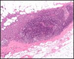 Micrograph showing a lymph node invaded by ductal breast carcinoma and with extranodal extension of tumor. Courtesy of Nephron, Wikimedia Commons