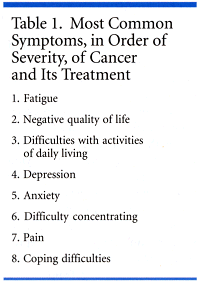 The survey found that fatigue and lack of energy were the most severe symptoms regardless of type of cancer. Pain came in far down the list (see Table 1).