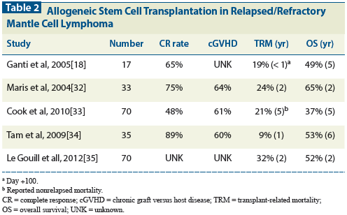 Table 2: Allogeneic Stem Cell Transplantation in Relapsed/Refractory Mantle Cell Lymphoma