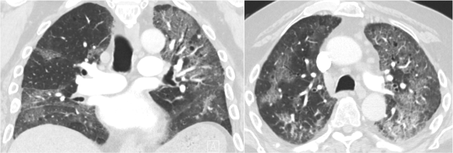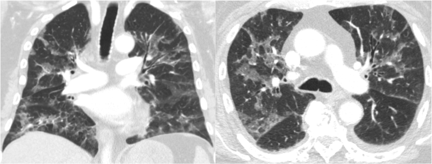 Figure 1Case 1: Coronal and axial computed tomography scans of the chest after administration of contrast demonstrate bilateral ground-glass opacities with associated septal thickening, the absence of pleural effusion, and no hilar adenopathy.