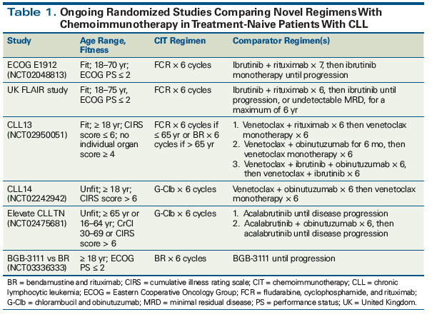 Table 1. Ongoing Randomized Studies Comparing Novel Regimens With Chemoimmunotherapy in Treatment-Naive Patients With CLL