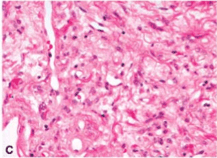 (C) H&E stain of angiomyofibroblastoma composed of a proliferation of vascular spaces with relatively hypercellularstroma and spindled to ovoid cells displaying mild nuclear pleomorphism (magnification X400);