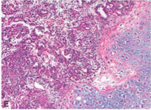(E) H&E stain of mixed malignant mllerian tumor with the left half of the photomicrograph displaying a high-grade adenocarcinoma component, and the right half displayinga chondrosarcoma component (magnification X100); (F) H&E stain of adenosarcoma showing benign glandular elements dispersed amongst a cellular stroma (magnification X40).