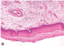 (D) H&E stain of fibroepithelial stromal polyp of the vagina covered by benign squamous epithelium. The subepithelial connective tissue is edematous and shows variable-sized blood vessels, some of which are thick-walled. The stroma ranges fromhypocellular to relatively hypercellular,and the stromal cells display mild pleomorphism (magnification X100);