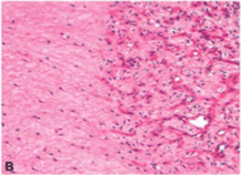 (B) H&E stain of aggressive angiomyxoma displaying proliferating capillary-sized blood vessels on the right and hypocellular stroma with spindle-shaped cells showing minimal cytologicatypia on the left (magnification X200);
