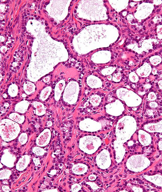 Micrograph of an ovarian clear cell carcinoma. Image © Nephron 2011.