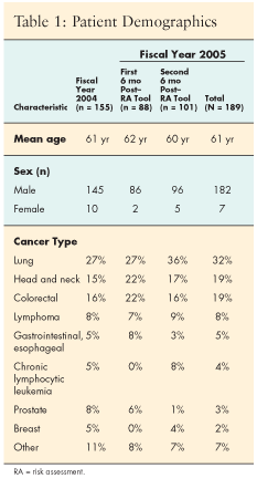 A total of 189 patients were evaluated with the risk assessment tool during FY05, including 88 in the first 6 months after its implementation and 101 in the second 6-month period. The comparison group comprised 155 patients treated in FY04, prior to use of the tool. Demographic characteristics are shown in Table 1. Patients treated in FY04 and FY05 were fairly well-matched and representative of the patient population treated at the VA.