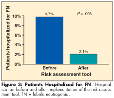 A chart review showed that of the 35 patients treated in 2003, after implementation of the tool, 72% received CSF compared with 28% of the 50 patients who were treated without the tool in 2000 (P < .001). Patients assessed and managed with the tool had a lower risk of FN, hospitalization for FN, treatment with intravenous antibiotics, chemotherapy dose delays, and chemotherapy dose reductions. The differences were clinically significant for all endpoints and the difference was statistically significant for dose delays (required for 9% of patients in 2003 vs 32% in 2001, P = .01).