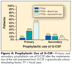 The use of G-CSF for secondary prophylaxis (for patients who were not given growth factor in the first cycle of chemotherapy and who developed neutropenia defined as ANC < 1,500/µL between cycles) was also studied. Secondary prophylaxis with G-CSF decreased from 12% (18/155) in FY04 to 10% (9/88) in the first 6 months of FY05 to 6% (6/101) in the second 6 months of FY05 (see Figure 4).