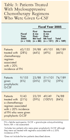 In FY04, prior to the implementation of the risk assessment tool, prophylactic G-CSF support was given to 6% (9/155) of all patients and 21% (9/43) of patients who were treated with chemotherapy regimens associated with a risk of FN ≥ 20%. In FY05, after the routine use of risk assessment, prophylactic G-CSF was provided to 39% (74/189) of all patients and 84% (74/88) of patients treated with chemotherapy regimens associated with a risk of FN ≥ 20% (Table 3). It should also be noted that the number of patients treated with chemotherapy regimens associated with a risk of FN ≥ 20% increased from 28% (43/155) in FY04 to 47% (88/189) in FY05.