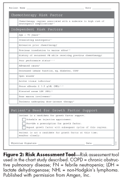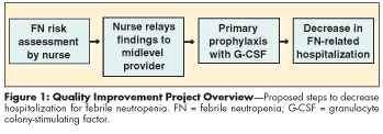 At our clinic, orders for G-CSF are written by midlevel providers (nurse practitioners and physician assistants) within their scope of practice. Completed chemotherapy orders, which include orders for prophylactic growth factors, require the co-signature of an oncologist. Because of their close, continuing communication with patients, nurses are in an ideal position to assume a role in neutropenic assessment prior to the initiation of chemotherapy, as well as before all subsequent cycles. The nursing staff at the Puget Sound Veterans Affairs (VA) Medical Center Cancer Care Clinic implemented a risk assessment tool to identify patients at risk for FN, and therefore are candidates for prophylactic G-CSF. The primary objective of this continuous quality improvement project was to minimize the incidence of hospitalizations due to FN (Figure 1).