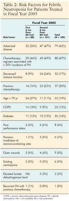 This study shows the potential benefit of routine and systematic evaluation of patients by nurses using a risk assessment tool for FN. In our study, the implementation of the risk assessment tool significantly reduced the number of hospitalizations for FN by 78%, from 9.7% of all patients in 2004 (before the implementation of the tool) to 2.1% of all patients in 2005 (P = .003). The total number of hospital days also decreased, from 117 in 2004 to 24 in 2005, and the average length of hospital stay decreased from 7.8 to 6 days in the respective periods.