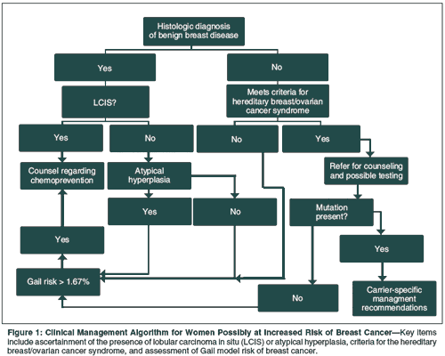 The single most important risk factor for breast cancer is age, and hormonally linked reproductive and anthropometric risk factors contribute to the etiology of the disease.[1-3] There is an increase in the risk of breast cancer among women who have benign breast disease, especially those with atypical ductal or lobular hyperplasia.[4,5] Lobular carcinoma in situ (LCIS) increases risk significantly, as do a history of breast cancer in first-degree relatives and the presence of BRCA1 or 2 mutations.[6] Surprisingly, and perhaps counterintuitively, diet, exercise, and environmental factors play a very small role in overall risk. Mammographic breast density increases relative risk fivefold among women with the highest density, and breast cancer risk is two to three times greater in women with elevated serum levels of estradiol or testosterone.[7] Multivariable risk models allow determination of composite relative risks along with cumulative lifetime risk, although improved models for African-American women are required.