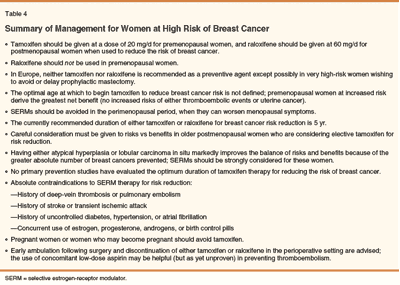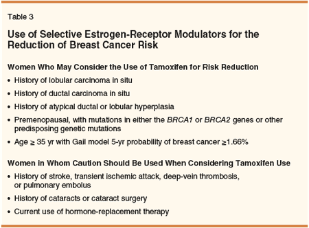 Risk-Benefit Considerations Guidelines for the use of SERMs for breast cancer risk reduction are listed in Table 3. Of the more than 65 million women aged 35 to 79 years without reported breast cancer in the United States in 2000, more than 10 million women would be eligible for tamoxifen chemoprevention using widely accepted definitions of increased risk.[31] The percentage of eligible women varies by race, with 19% of white women, 6% of black women, and 3% of Hispanic women being eligible. Of the more than 50 million white women in the United States aged 35 to 79 years, nearly 2.5 million would have a positive benefit-risk index for tamoxifen chemoprevention.