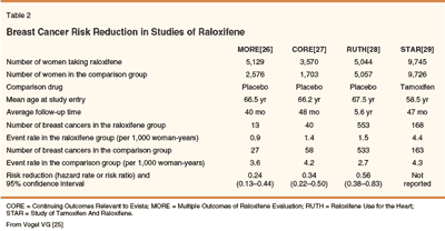 Compared to placebo in postmenopausal women at average risk of breast cancer in the published osteoporosis trials, raloxifene reduces the risk of invasive breast cancer by 44% to 76%, as summarized in Table 2.[25] Among younger postmenopausal women who are at increased risk of breast cancer, raloxifene is as effective as tamoxifen in reducing the risk of invasive breast cancer. Raloxifene appears to be less effective than tamoxifen in reducing the risk of in situ breast cancer, although the results in the STAR trial were not statistically significant. Across all placebo-controlled trials with raloxifene, however, in situ cancers occurred more often with raloxifene than with placebo or tamoxifen. In high-risk, younger postmenopausal women, raloxifene appears to offer a net benefit when balancing reduction of the risk of breast cancer and the prevention of fractures against the risk of stroke, venous thromboembolic events, uterine events, and symptomatic side effects. Other agents such as the aromatase inhibitors are in development for breast cancer risk reduction in the postmenopausal population, and preliminary results from ongoing prevention trials are expected in the next few years.