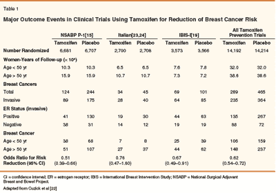 An analysis of the large, prospective breast cancer risk-reduction trials that used tamoxifen was published in 2003.[22] These results are summarized in Table 1 (the individual results of the Italian prevention studies have not been presented here). Overall, the trials demonstrated that tamoxifen decreased breast cancer incidence by 38% (95% CI = 28%–46%; P < .0001), and estrogen receptor–positive tumors by 48% (95% CI: 36%–58%; P < .0001). The risk of side effects attributable to tamoxifen was reduced by the concomitant use of low-dose aspirin, as well as by careful selection of women to exclude those with risk factors for thromboembolism (eg, obesity and age) and endometrial cancer (postmenopausal women).
