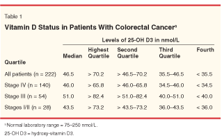 We recently evaluated the 25-OH D3 status in 222 patients treated in the colorectal cancer clinic at Roswell Park Cancer Institute. Serum samples were immunoassayed in a commercially available standardized test (normal recommended range: 75-250 nmol). Extreme vitamin D deficiencies were noted in the overall population, with the median 25-OH D3 level being 46.5 nmol/L. Deficiencies were seen across the board for all stages of disease (Table 1). Only the upper quartile (25-OH D3 > 70 nmol/L) of the tested population approached the normal recommended range of 75 nmol/L for optimal vitamin D status. Our results confirm the severe vitamin D deficiency status of patients with colorectal cancer and thus the need for higher doses of vitamin D3.