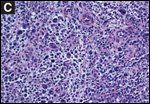 • Morphology-Primary C-ALCL is characterized by cohesive sheets of large cells with an anaplastic, pleomorphic, or immunoblastic morphology (Figure 1B and 1C). However, there are no differences in prognosis or survival rate based on cytomorphology. According to the WHO/EORTC consensus classification, C-ALCL is defined by CD30 expression of at least 75% of the large lymphoid cells.[11] Unlike LyP, only a few neutrophils or eosinophils are present in C-ALCL, although neutrophil-rich (pyogenic) tumors have been seen.[29] Other variants, such as sarcomatoid and keratoacanthoma-like types, have also been described.[5,30] The atypical cells generally show an activated CD4+ T-helper cell phenotype with variable loss of T-cell markers and expression of cytotoxic proteins such as granzyme B, TIA-1, and perforin in about 50% of the cases.[31] Other activation markers such as CD25 (IL-2R) and HLA-DR are also found. CD8+ T-cell phenotype as well as a null CD4–CD8– phenotype and coexpression of CD56 and CD30 have rarely been reported.