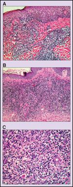 Three histologic types have been identified, characterized as type A, B, and C (Table 1). Types A and C consist of large atypical lymphocytes resembling Reed-Sternberg cells. Type A cells are embedded in a dense inflammatory background with histiocytes, neutrophils, and eosinophils, and can resemble Hodgkin's disease, whereas type C cells are characterized by sheets of similar large atypical lymphocytes with prominent lavender nucleoli and open chromatin with fewer interspersed inflammatory cells (Figure 2). Only a few inflammatory cells are present. Type B simulates classical MF features, with epidermotropism and a dermal band-like infiltrate composed of small to medium-sized cells. It may represent an early stage in the evolution of the more conventional type A presentation.