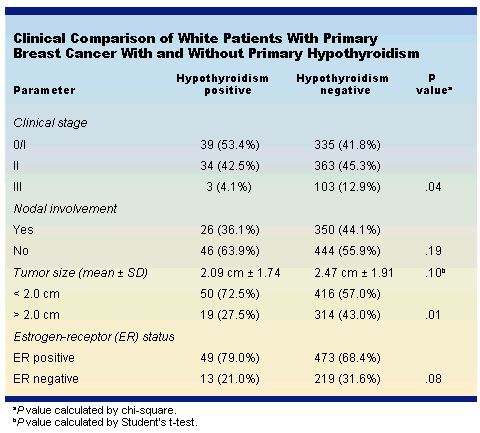 Furthermore, as shown in the Table, invasive breast cancer among patients who were hypothyroidism-positive tended to be less severe. They were likely to have earlier stage disease, smaller tumors, less nodal involvement, and a greater probability of estrogen-receptor (ER)-positive disease. (The table includes only white patients, who comprised the majority of cases analyzed.)