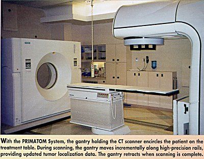 The PRIMATOM System consists of a Siemens CT scanner on a sliding gantry combined with a PRIMUS Linear Accelerator (see Figure). The technology provides oncologists for the first time with accurate, almost real-time diagnostic-quality images of tumors within the treatment room, the company said in a news release. It allows the patient to remain on one table while the tumor is pinpointed and treatment is delivered, said James Wong, MD, of Morristown.