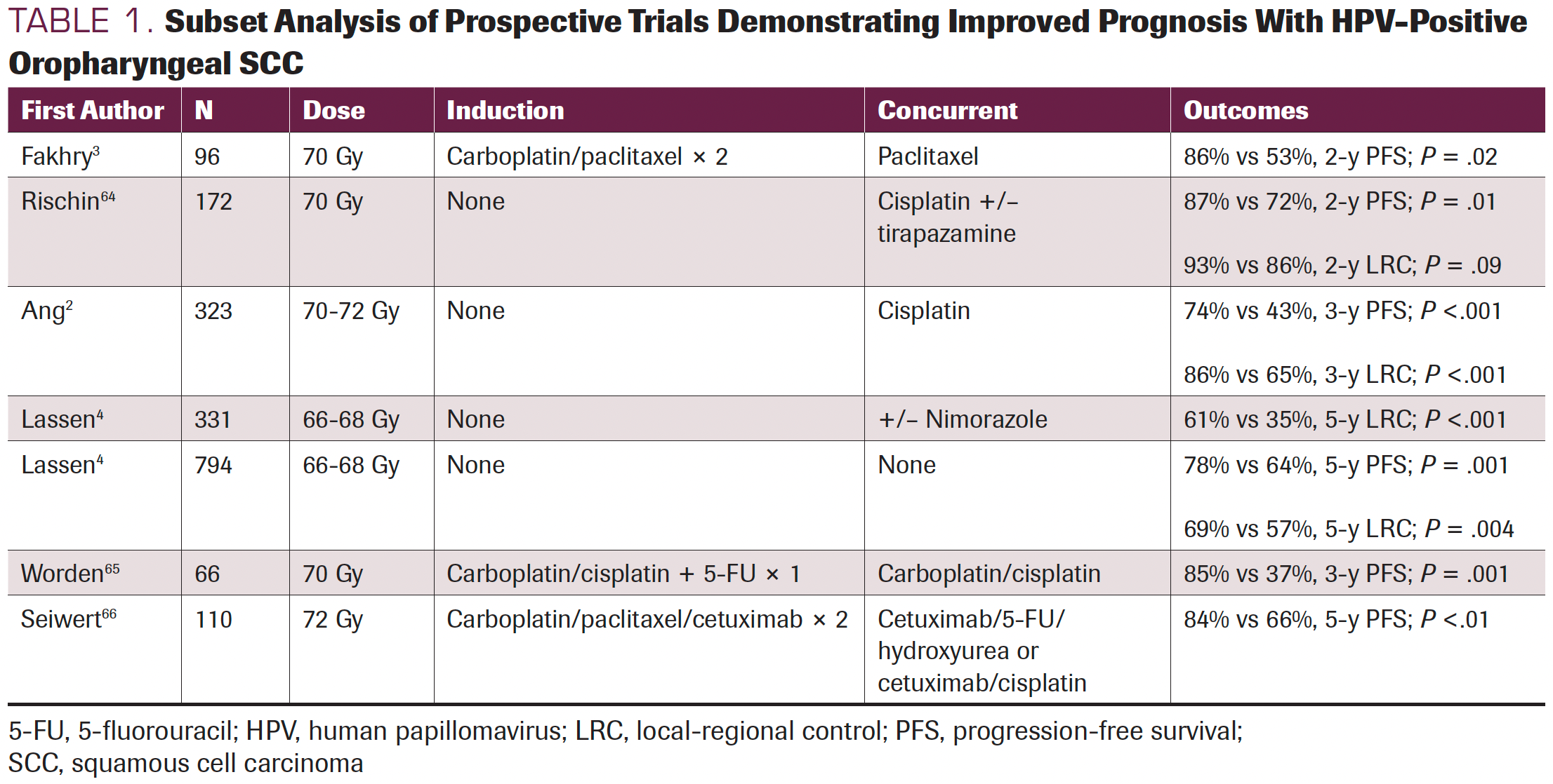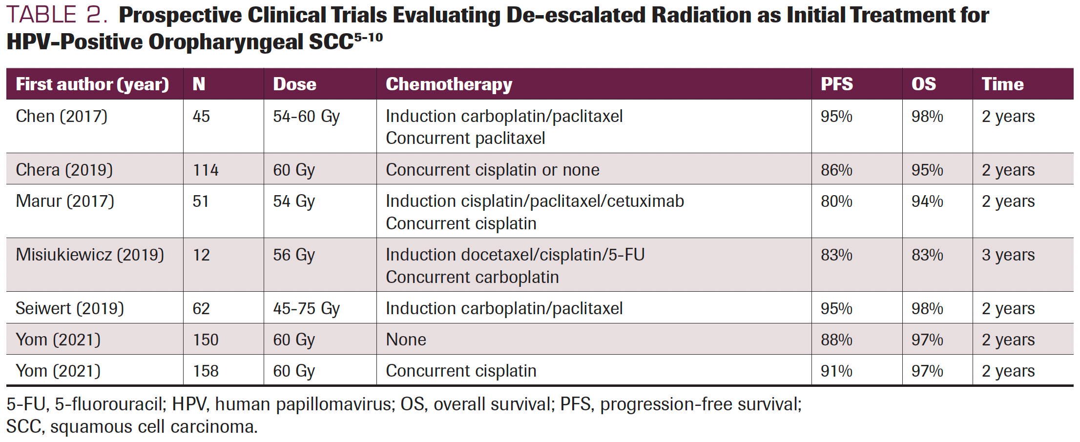 Over the past decade, several prominently published prospective trials (Table 2) have demonstrated promising outcomes with de-escalated radiation regimens using doses that are lower than those conventionally accepted.5-10 Although the trial designs have varied, the results have consistently shown that de-escalated radiation for HPV-positive oropharyngeal SCC can maintain the historically high rates of cure while significantly decreasing toxicity and improving QOL, thus largely validating the premise for which de-escalation was proposed.