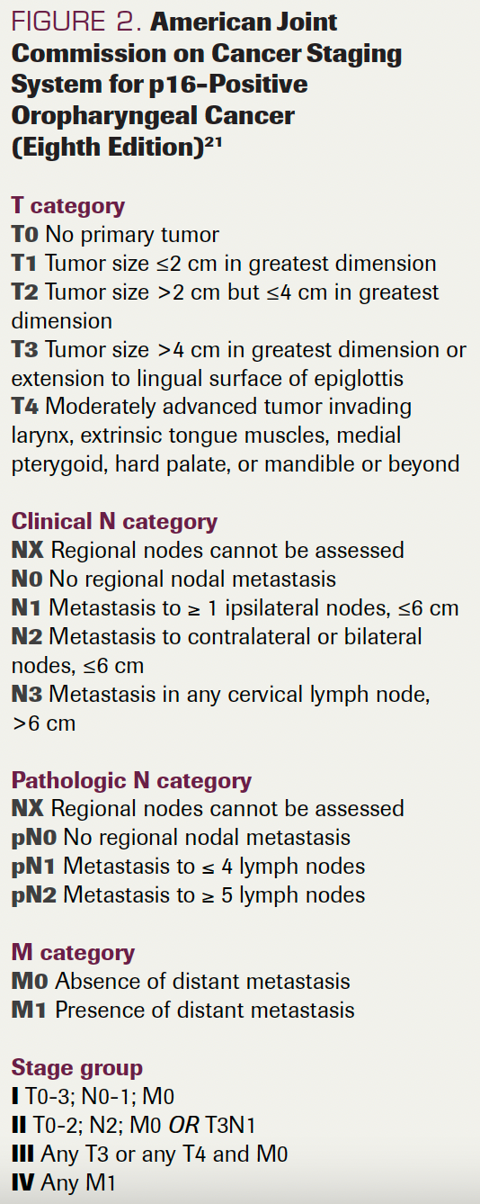 Patients with newly diagnosed HPV-positive SCC localized to the head and neck and originating from the oropharynx (ie, the tonsils, base of tongue, or uvula) are potential candidates for de-escalation. The exact type of de-escalation treatment may vary depending on the extent and location of the disease. However, given the strong link between HPV and radiation response, the American Joint Committee on Cancer (AJCC) created a new staging system in 2016 (Figure 2)21 specifically for patients diagnosed with HPV-positive oropharyngeal SCC to reflect its favorable prognosis vs HPV-negative disease.21 Notably, many HPV-positive tumors that had been previously categorized as stage IV were significantly “downstaged” to stage II or even stage I cancers. This new staging system has prompted many investigators to question historical treatment paradigms.22 Published data have also suggested that the favorable impact of HPV positivity on prognosis is particularly strong for those deemed “never smokers” or even those with a minimal smoking history, thereby suggesting that these patients might benefit the most from de-escalation.23