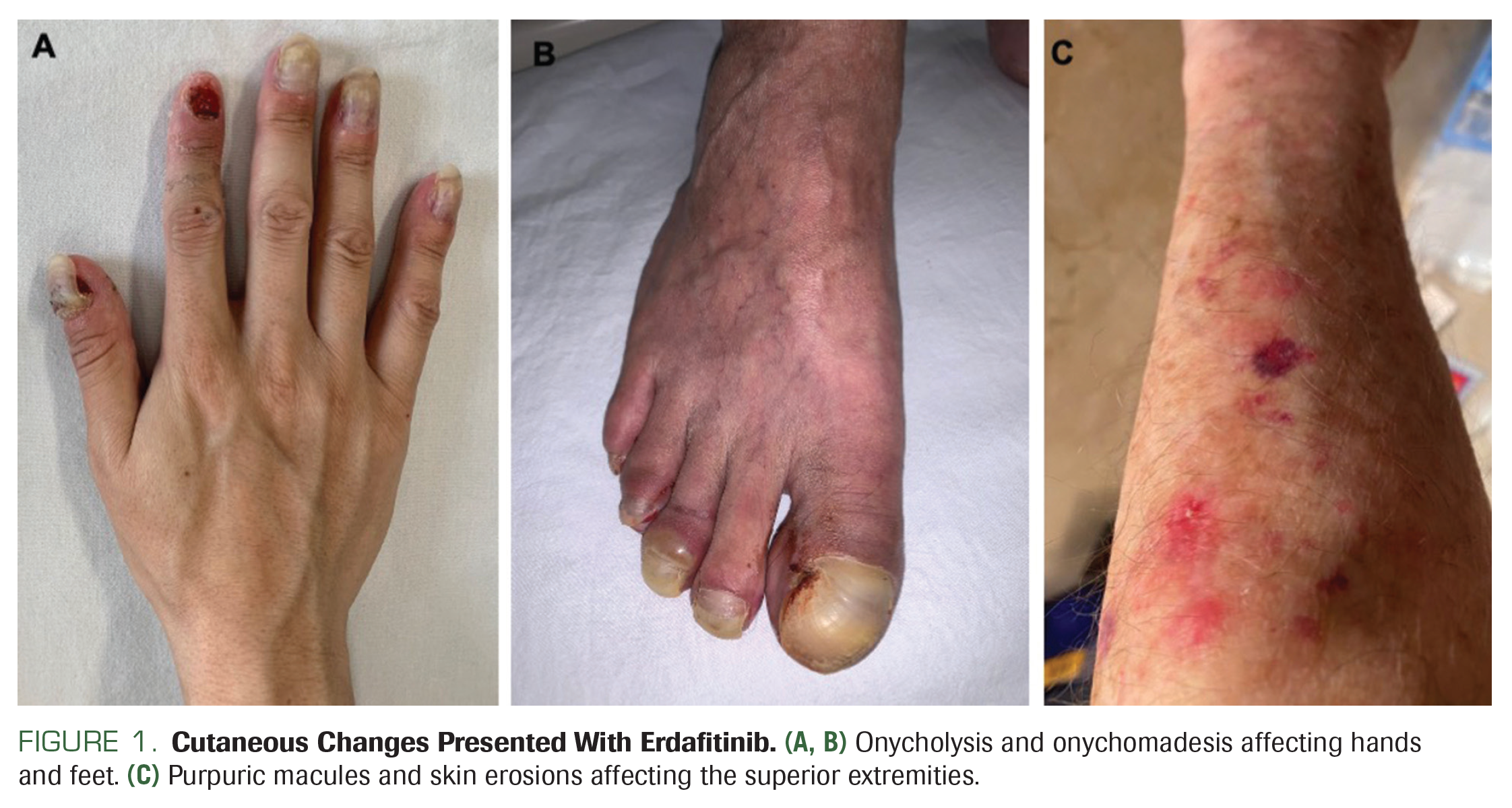 The patient was started on erdafitinib 8 mg daily, and while he was on this dosage, he presented with grade 2 hyperphosphatemia of 8 mg/dL. Erdafitinib treatment was temporarily withheld until his phosphorus level reached less than 5.5 mg/dL, accomplished with dietary phosphate restriction to 600 to 800 mg/ day; then, erdafitinib was restarted at the same dose. Thereafter, he experienced onycholysis, onychomadesis, Beau lines, and paronychia, with purpuric skin lesions and erosions (Figures 1A-1C). Grade 2 nail loss with superinfection was diagnosed and erdafitinib treatment was delayed for 14 days with weekly reassessment. He received oral trimethoprim/sulfamethoxazole for 2 weeks with improvement of symptoms to grade 1. Afterward, he restarted erdafitinib with a dose reduction to 6 mg daily, resulting in better tolerance. The patient achieved clinical response with reduction of metastatic bone lesions, and a CT scan at 10 weeks after he began erdafitinib revealed a PR according to RECIST criteria (Figures 2A-2H).