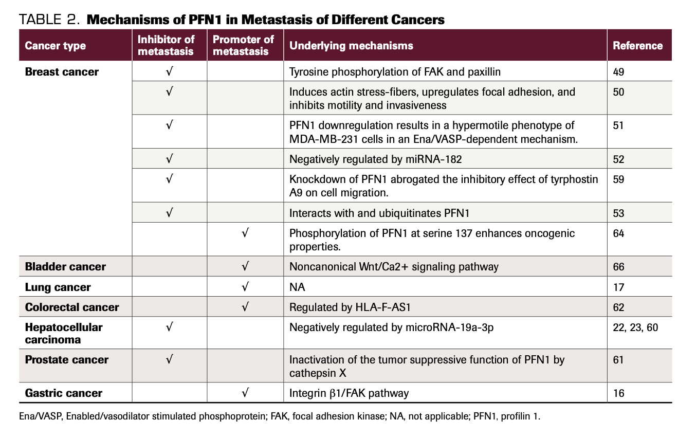 TABLE 2. Mechanisms of PFN1 in Metastasis of Different Cancers