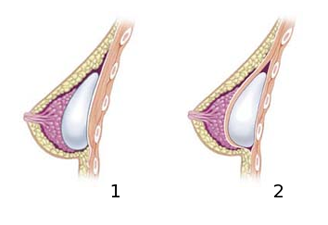 1) Breast after subglandular augmentation; 2) Breast after submuscular augmentation