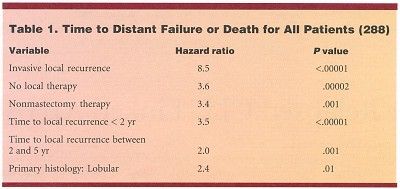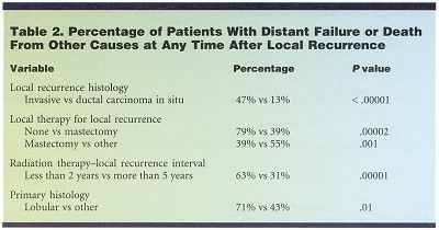 The Harvard group concluded that patients with local recurrence after conservative surgery and radiation therapy can have prolonged disease-free survival. Patients with a noninvasive local recurrence, longer interval to local recurrence, nonlobular histology, and treatment with mastectomy had a longer time to distant failure or death from other causes than other patients.