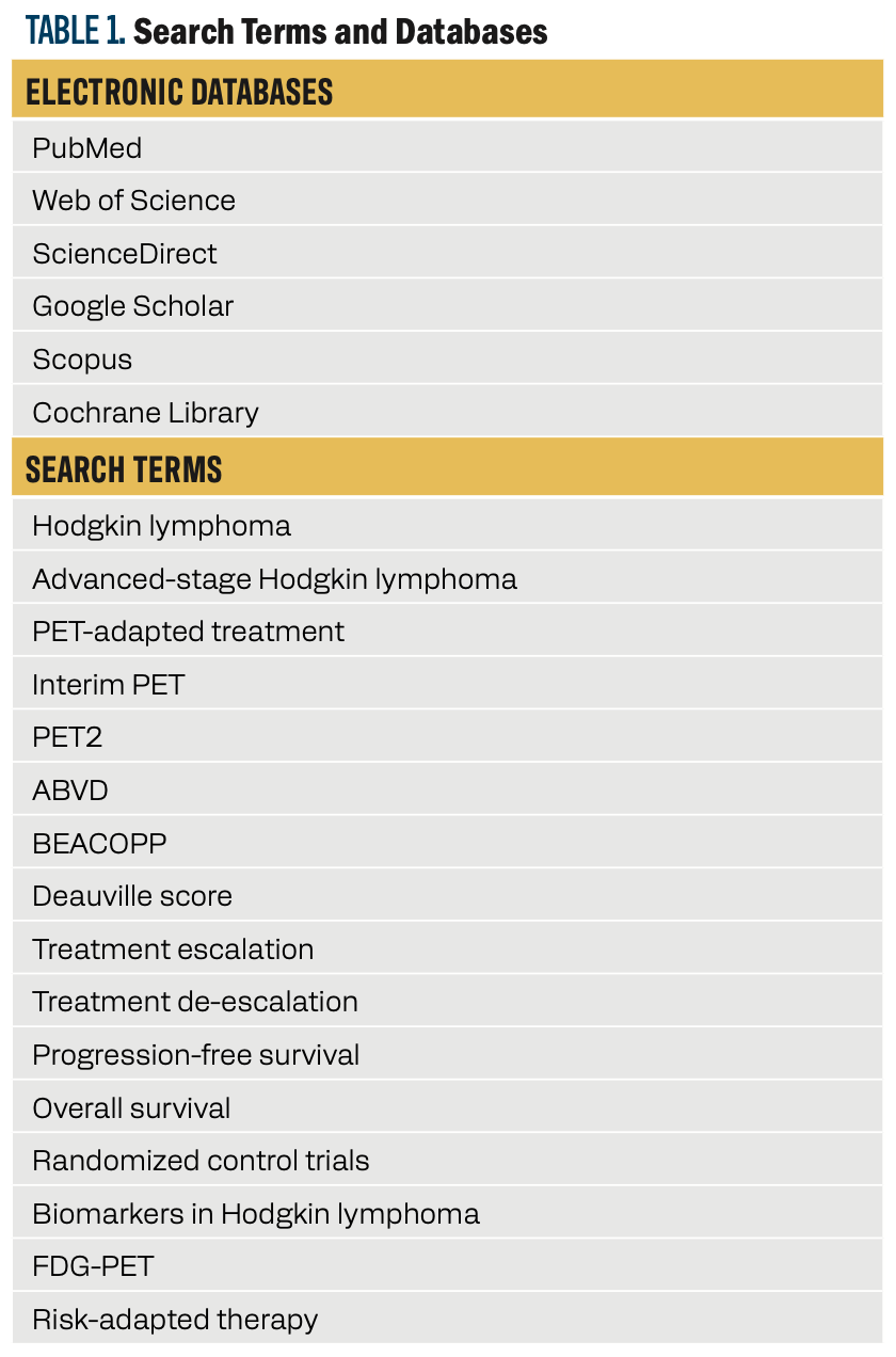 This review aimed to provide an answer to this question: How have PET-adapted treatment strategies advanced the treatment of advanced-stage cHL, and what treatment algorithms have been established based on randomized trials? To answer this question, this review performed an extensive search of existing research studies, clinical trials, and systematic reviews on PET-adapted treatment approaches in ASHL. In this study, electronic databases including PubMed, Web of Science, ScienceDirect, Google Scholar, Scopus, and the Cochrane Library were used to search for relevant data. This research was designed to examine the use, effectiveness, and future perspectives of PET-adapted approaches in ASHL with the goal of maximizing treatment effects while reducing toxicity. The search terms used included the following: “Hodgkin lymphoma,” “advanced-stage Hodgkin lymphoma,” “PET-adapted treatment,” “interim PET,” “PET2,” “ABVD,” “BEACOPP,” “Deauville score,” “treatment escalation,” “treatment de-escalation,” “progression-free survival,” “overall survival,” “randomized controlled trials,” “biomarkers in Hodgkin lymphoma,” “FDG-PET,” and “risk-adapted therapy.” Boolean operators (AND, OR) and proximity operators (NEAR, NEXT, WITHIN) were applied to narrow down the search. The search was restricted to articles published between 2000 and 2024 to guarantee the inclusion of the latest and most applicable studies. Table 1 summarizes the search terms and databases utilized.