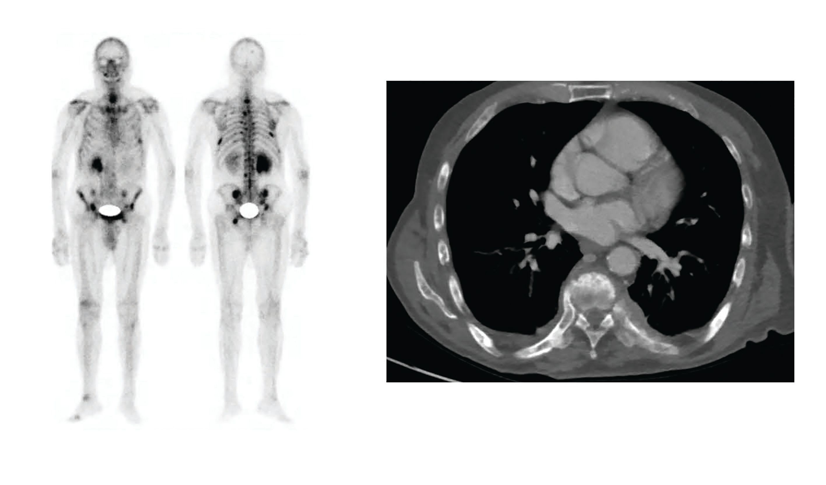 Figure 1. A bone scan showed metastases in both iliac crests, the ischium, cervical spine, and ribs (left). A computed tomography scan showed bilateral subpleural nodules consistent with metastatic disease (right).