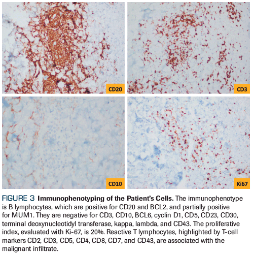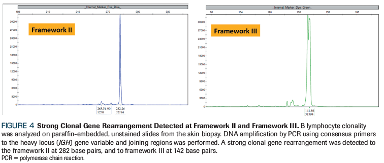 A 70-year-old woman developed red-to-violaceous papules, plaques, and nodule- like skin lesions several months prior to her presentation. The skin lesions mostly involved her lower neck and abdominal area (Figure 1). Initial topical and/or systemic treatments with antibiotic, antifungal, and allergy medications failed to provide a definitive clinical improvement, so a skin biopsy was performed. Hematoxylin and eosin staining of the skin biopsy revealed a dense lymphoid infiltrate involving the dermis, with small- to intermediate-sized lymphoid cells (Figure 2). Immunophenotyping confirmed the presence of B cells with positive CD20 and BCL2, as well as partially positive MUM1. Tests for CD3, CD10, BCL6, cyclin D1, CD5, CD23, CD30, terminal deoxynucleotidyl transferase, kappa, lamda, and CD34 were negative (Figure 3). The Ki-67 proliferative index was 20%, and the clonality of B lymphocytes was analyzed on paraffin-embedded, unstained slides from the skin biopsy. DNA amplification by polymerase chain reaction using consensus primers to the heavy locus (IGH) gene variable and joining regions was performed. A strong clonal gene rearrangement was detected to the framework II (FR2) region at 282 base pairs, and to the framework III (FR3) region at 142 base pairs (Figure 4).