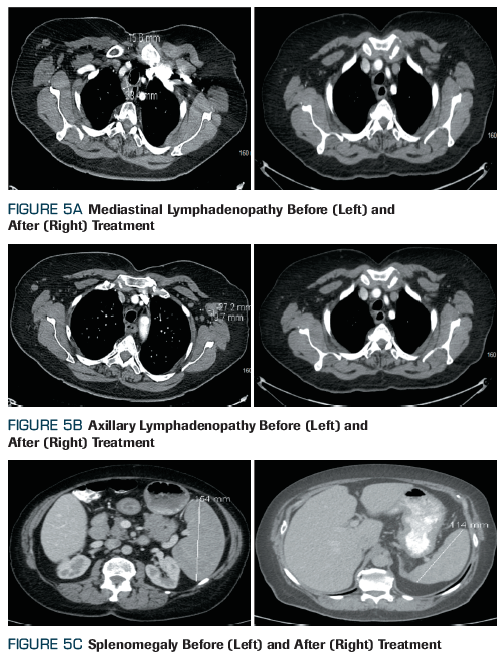 Figure 5. (A) Mediastinal Lymphadenopathy Before (Left) and After (Right) Treatment; (B) Axillary Lymphadenopathy Before (Left) and After (Right) Treatment; (C) Splenomegaly Before (Left) and After (Right) Treatment