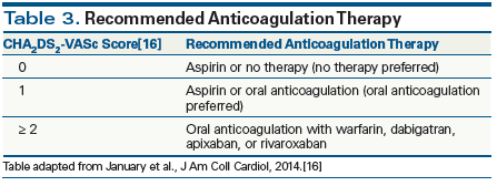 15. Mason PK, Lake DE, DiMarco JP, et al. Impact of the CHA2DS2-VASc score on anticoagulation recommendations for atrial fibrillation. Am J Med. 2012;125:603.e1-e6.