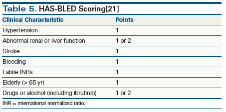 For patients receiving ibrutinib who develop AF, we suggest calculating CHA2DS2-VASc and HAS-BLED scores in order to provide them and their treating physicians with a rough estimate, as a starting point, of the risk of a thromboembolic complication due to AF and the increased risk of bleeding with the addition of anticoagulation. We recognize that the risk of bleeding provided by the HAS-BLED score does not fully quantify the added risk of bleeding due to ibrutinib therapy. Thus, the HAS-BLED estimate essentially provides a lower-bound estimate of a bleeding complication, and the actual risk of a bleeding complication in patients who continue treatment with ibrutinib is likely higher. Nonetheless, these scores allow identification of a proportion of patients for whom the risk of a thromboembolic event is purported to be lower than the risk of bleeding. In these patients, ibrutinib should be continued without the addition of anticoagulation.