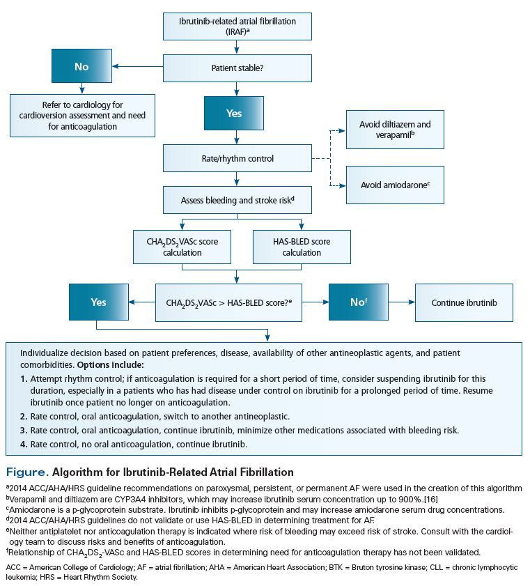 Appropriate management of comorbidities and concomitant medications is essential to maintaining adherence to oral tyrosine kinase inhibitor therapy, regardless of disease state. IRAF is seen in 6% to 11% of patients receiving ibrutinib.[1,6] It is not known whether initiation of anticoagulation after the development of IRAF will decrease thrombotic stroke risk without increasing hemorrhagic stroke risk. For IRAF, we propose an algorithm to help guide drug choices, minimize the potential for drug-drug interactions, and involve and educate the patient in treatment planning. It is our belief that there must be a compelling reason to initiate anticoagulation for IRAF, as there have been no reported cases of thrombotic stroke due to IRAF. We place more emphasis on the importance of rate/rhythm control and continuation of ibrutinib therapy, and less on the need for anticoagulation. Clinical trial validation using this model is needed.
