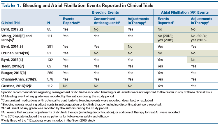 In 2015, Chanan-Khan and colleagues conducted a double-blind, placebo-controlled phase III trial assessing the safety and efficacy of adding ibrutinib (420 mg) to bendamustine plus rituximab (BR) vs placebo added to BR in 578 patients with relapsed or refractory CLL or SLL.[9] Patients were excluded from the trial if they had a history of stroke, intracranial hemorrhage, or clinically significant cardiovascular disease within the 6 months prior to randomization. Patients were also excluded if they required concomitant anticoagulation with warfarin or other vitamin K antagonists or strong CYP3A4/A5 inhibitors. Authors reported any-grade bleeding events in 89 patients (31%) in the ibrutinib group vs 42 patients (15%) in the placebo group. The authors reported major hemorrhage in 11 patients (4%). Six of the 11 patients were receiving concomitant anticoagulant or antiplatelet treatment. Major hemorrhage events required ibrutinib discontinuation in 2 of these 11 patients. Twenty-one patients (7%) in the ibrutinib group experienced AF (grade 1/2) vs 7 patients (2%) in the placebo group. Of note, 25 patients in the ibrutinib group had a history of AF or flutter; 7 of these patients developed AF or flutter during the study period. The authors reported that most patients with comorbid cardiac disorders at randomization did not develop AF or flutter. Of the 289 patients in the ibrutinib group, 4 (1%) discontinued ibrutinib therapy upon development of AF. Seven patients in the ibrutinib group had treatment withheld due to AF or flutter. These events resolved with no further AF episodes during the study period.