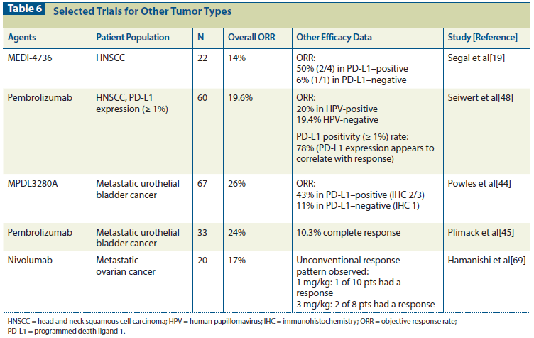 Head and neck squamous cell carcinoma (HNSCC) is another tumor well suited for PD-1 and PD-L1 blockade. Similar to lung and bladder cancers, it carries high mutation rates.[43] PD-L1 expression has been well documented, and the PD-1 pathway has been implicated in immune resistance in human papillomavirus (HPV)-associated HNSCC.[46] A gene expression signature study has shown that about one-third to one-half of the examined HNSCC samples had an immune cell phenotype similar to that seen in MEL. PD-L1 expression and the presence of tumor-infiltrating lymphocytes were strongly associated with the mesenchymal phenotype of HNSCC, suggesting a potential benefit for PD-1 blockade.[47] Indeed, several PD-1 and PD-L1 antibodies have induced impressive objective responses. Preliminary data on the antitumor activity of pembrolizumab from the HNSCC dose expansion cohort of the phase Ib KEYNOTE-012 trial were recently presented.[48] Patients had to have at least 1% PD-L1 expression in their tumor samples to participate. Sixty eligible patients were treated with pembrolizumab. At the time of data cutoff in May 2014, the best overall response rate was 19.6% (95% CI, 10.2–32.4). Both HPV-positive and HPV-negative patients responded in equal percentages. One patient had pseudoprogression followed by partial response on treatment.