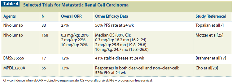 In patients with mRCC, 2 of 17 (12%; 95% CI, 2–36) had an objective response to 10 mg/kg of BMS-936559, with responses lasting 4 and 17 months.[17] Seven additional patients (41%; 95% CI, 18–67) had stable disease lasting at least 24 weeks.