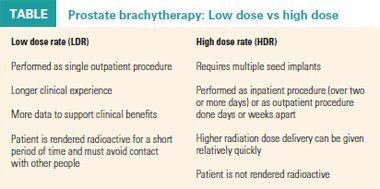Prostate brachytherapy generally falls into two categories: low dose rate (LDR) and high dose rate (HDR). LDR is still the most widely used, particularly in men who are deemed low-risk, while HDR, in combination with external-beam radiotherapy (EBRT), has historically been reserved for men with intermediate- to high-risk cancers. Both approaches have their pros and cons (see Table).